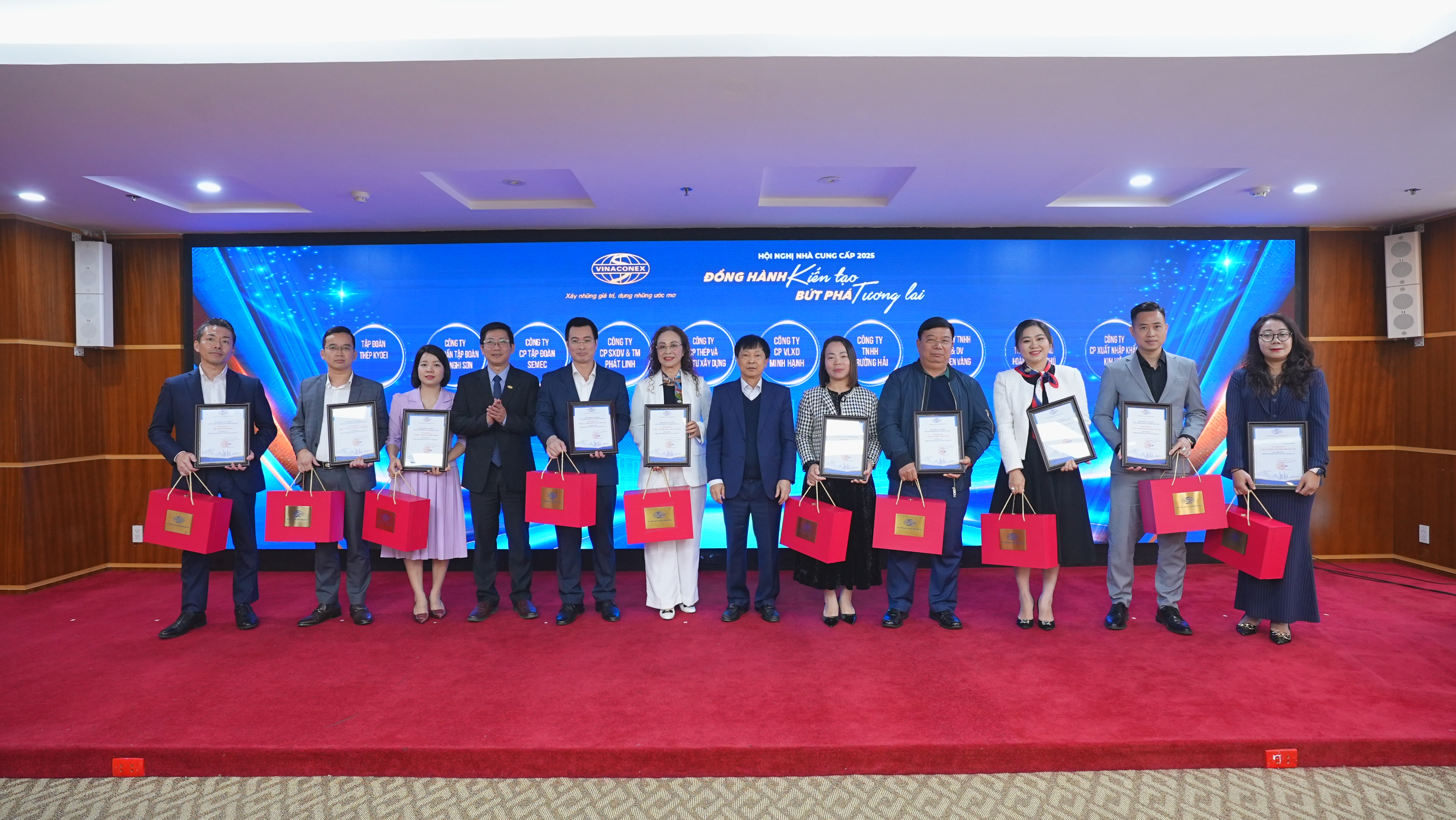 Tại sự kiện, Chủ tịch HĐQT Nguyễn Hữu Tới và các lãnh đạo Tổng công ty cũng đã trân trọng trao tặng ‘Chứng nhận đồng hành’ và món quà lưu niệm đến các nhà cung cấp đã luôn đồng hành cùng VINACONEX. Món quà lưu niệm có hình ảnh con thuyền no gió vươn mình ra khơi mang theo ý nghĩa sâu sắc: tượng trưng cho sự hợp tác thuận buồm xuôi gió, cùng nhau vượt sóng, hướng đến những chân trời mới. Đây không chỉ là sự ghi nhận những đóng góp trong quá khứ, mà còn là cam kết cho hành trình đồng hành lâu dài, cùng xây dựng và phát triển tương lai thịnh vượng giữa VINACONEX và các đối tác.